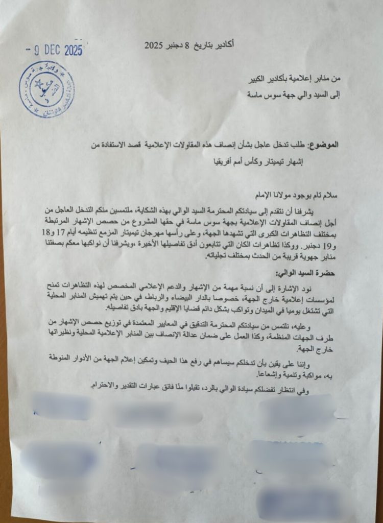 المنابر الإعلامية الموقعة على الشكاية شددت على أن جزءاً كبيراً من الإشهارات يتم منحه لمؤسسات وطنية خارج الجهة، خاصة في الرباط والدار البيضاء، في وقت يُسجَّل فيه تهميش واضح للإعلام المحلي الذي يعمل يومياً في الميدان ويغطي مختلف القضايا والملفات المرتبطة بالجهة على مدار السنة.