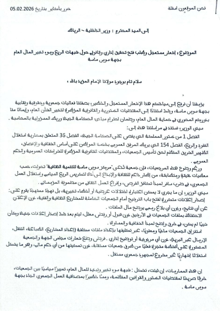 سوس ماسة – وجهت مجموعة من الفعاليات الجمعوية والحقوقية والنقابية بجهة سوس ماسة مراسلة رسمية إلى السيد وزير الداخلية بالرباط، تطالب من خلالها بفتح تحقيق إداري ومالي مستعجل بخصوص ما وصفته بـ“شبهات الريع وسوء تدبير المال العام” المرتبط بالدعم العمومي الموجه للعمل الثقافي بالجهة.