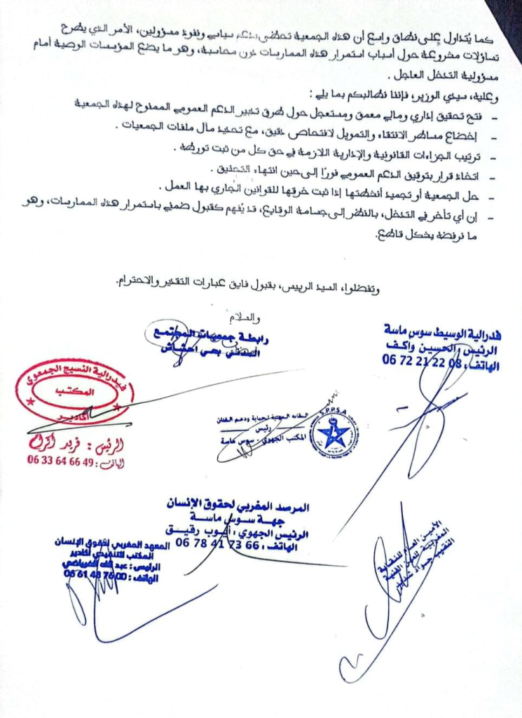 وترى الهيئات الموقعة أن هذه الوقائع، في حال ثبوتها، قد تشكل شبهة سوء تدبير للمال العام وتمييزًا بين الجمعيات، بما يمس بمصداقية العمل الجمعوي الجاد داخل جهة سوس ماسة.