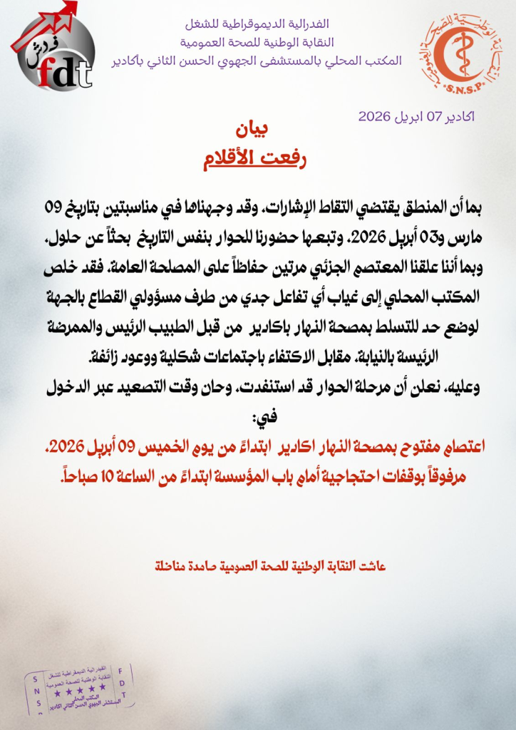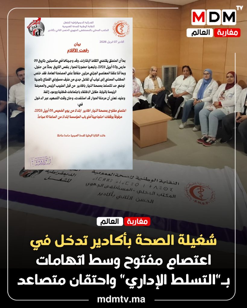 دخلت الشغيلة الصحية بالمستشفى الجهوي الحسن الثاني بأكادير، في خطوة تصعيدية غير مسبوقة، تمثلت في إعلان اعتصام مفتوح داخل مصحة النهار ابتداءً من يوم الخميس 09 أبريل 2026، وذلك بدعوة من المكتب المحلي للنقابة الوطنية للصحة العمومية المنضوي تحت لواء الفيدرالية الديمقراطية للشغل، في ظل ما وصفته النقابة بانسداد أفق الحوار مع الجهات المسؤولة على المستوى الجهوي.