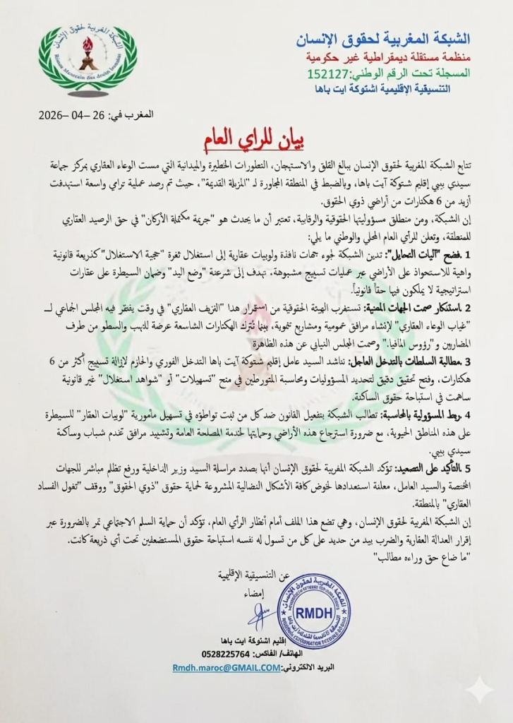 بيان ناري: الشبكة المغربية لحقوق الإنسان تفضح تراميًا خطيرًا على أراضي ذوي الحقوق بسيدي بيبي وتطالب بفتح تحقيق ومحاسبة المتورطين